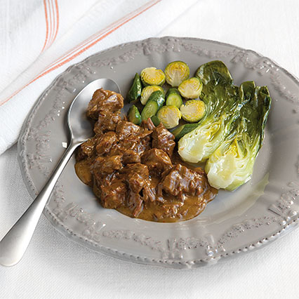 into chunks about 4cm long. Heat 2 tablespoons of oil in the open cooker, then toss the meat on a high heat for about 2-3 minutes. Add salt and pepper, then add the spices and mix with a wooden spoon. Add the white wine, then sprinkle with the flour and mix for another minute. Add the remaining 3 ecodoses of water, close the lid and cook on position 2 for 27 minutes after the hiss.