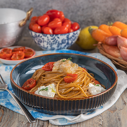 Fai cuocere in acqua bollente salata le linguine, scolale molto al dente e mettile in una padella assieme alla bisque, poi mantecale con un filo di olio EVO e aggiungi i pomodorini confit; amalgama tutto.