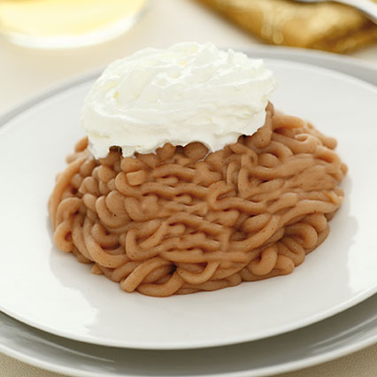 Put the mixture in a clean saucepan, add half an ecodose of milk and butter, stir with a wooden spoon and cook on low heat until the mixture absorbs all the milk. Let cool completely, then put the chestnuts into a potato masher and squeeze them in a serving bowl.