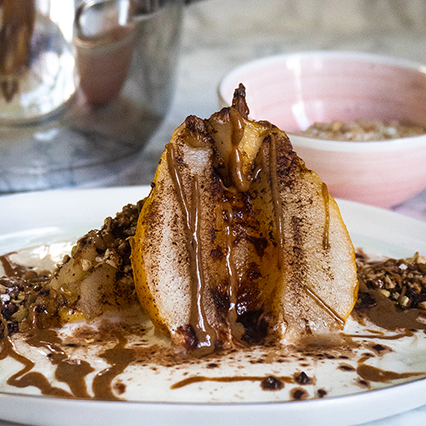Pera cotta, cannella, yogurt greco e burro di nocciole
