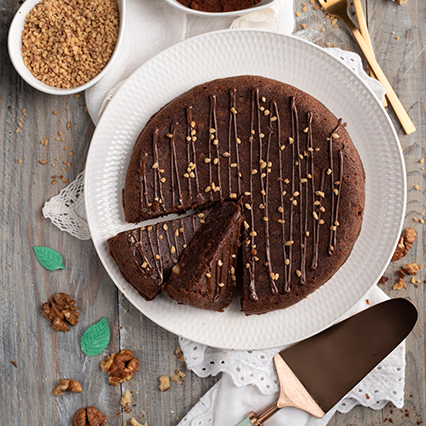 Estrai la torta, adagiala capovolta sul piatto prescelto e guarniscila con del cioccolato fondente fuso e un po’ di granella di noci.