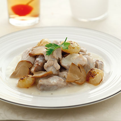 6 Toss the meat in the sauce, heat it all up and serve with the onions and mushrooms.