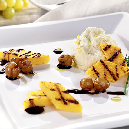 Baccalà mantecato con crostini di polenta grigliati e uva all'aceto balsamico