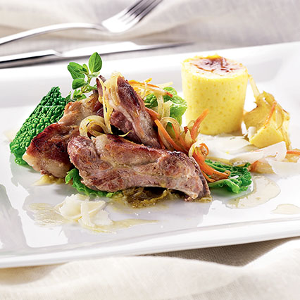 Tagliate la cipolla a julienne (listarelle sottili). Scottate in acqua bollente e salata la verza tagliata a pezzettoni per alcuni minuti. Fate rosolare la cipolla con l'olio nella pentola ed aggiungete le costine. Salate e pepate e fate rosolare bene. Unite la verza sbianchita e fate insaporire. Bagnate con il brodo e fate cuocere per 25 minuti dall’inizio del sibilo. Una volta cotte la carne e le verze, toglietele dalla pentola e mantenetele in caldo. A parte frullate il parmigiano, i tuorli d'uova e la panna. Ungete degli stampini di alluminio, versatevi dentro il composto, poneteli nel cestello cuocivapore e fate cuocere nella pentola a pressione aggiungendo 4 dl d'acqua per 7 minuti dall'inizio del sibilo. Una volta cotto il budino, lasciatelo intiepidire leggermente prima di sformarlo. Servite la carne e le verze accompagnate dal budino al formaggio.