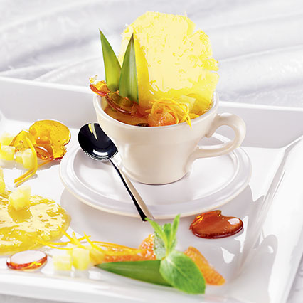 Per prima cosa, fate bollire il latte con la buccia di arancia e la vanillina. A parte unite 125 g di zucchero con le uova, il succo dell'arancia e l'aroma d’arancia. Unite il latte al composto e riempire delle cocottine di ceramica. Fate cuocere le cocottine coperte da un foglio di alluminio nel cestello della pentola a pressione, per 4 minuti calcolati dall’inizio del sibilo, con 4 dl d'acqua. Aprite a termine cottura e lasciate raffreddare. Tagliate intanto l'ananas in fette molto sottili. Fate caramellare il restante zucchero (circa 80 g ) con un cucchiaio d'acqua. Una volta che il caramello è diventato di color scuro ambrato, bagnate con il maraschino e due cucchiai d'acqua. Aggiungete l'ananas e fatelo insaporire bene. Servite la crema all'arancia direttamente nelle cocottine con sopra l'ananas caramellato tiepido.
