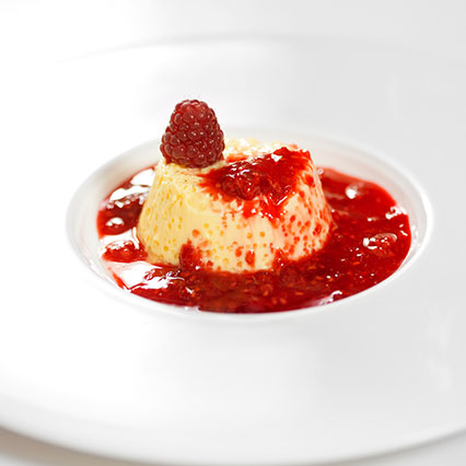 -Ora chiudete la pentola a pressione e accendete il fuoco (fiamma bassa), dopo il fischio continuate a cuocere per circa 14 minuti. Spegnete il fuoco e lasciate uscire bene il vapore. Fate raffreddare, aprite la pentola ed estraete lo stampo, facendo attenzione a non scottarvi le mani. Togliete l'alluminio e ricoprite lo stampo con la pellicola. Mettete in frigo e fate raffreddare per almeno 4 ore. Rovesciate il dolce su un piatto e servite in tavola con il coulis di lamponi.