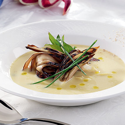 Iniziate tritando la cipolla e fatela poi rosolare con l'olio d'oliva, aggiungete il mais e la patata tagliata a piccoli pezzi. Fate insaporire bene e bagnate con il brodo vegetale. Chiudete e calcolate 20 minuti dall’inizio del sibilo. Poi, aprite e frullate con il mixer ad immersione fino ad ottenere una crema densa. A parte pulite il radicchio, tagliatelo in quattro parti longitudinalmente: salatelo, pepatelo e fatelo cuocere sulla griglia o in padella. Servite la crema di mais, adagiandovi sopra il radicchio trevigiano ed un filo d'olio d'oliva extravergine.
