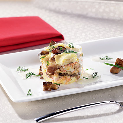 Fagottino di lasagne con robiola, salmone e funghi porcini