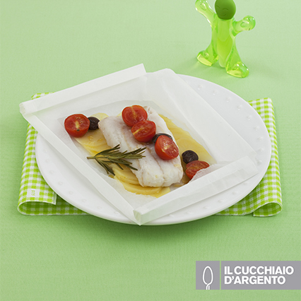 Ritagliate due quadrati di carta da forno di circa 33 centimetri di lato e stendeteli sul piano di lavoro. Sbucciate e lavate le patatine, affettatele finemente con una mandolina e posizionatele al centro di ciascun foglio, salatele leggermente. Controllate che i filetti di merluzzo siano privi di spine ed eventualmente eliminatele con l’apposita pinza, poi appoggiateli sopra le patate ripiegandoli a “v” se sono troppo lunghi. Lavate, asciugate e tagliate a metà i pomodorini e sistemateli su ciascun filetto di pesce. Unite le olive e il rametto di rosmarino.
