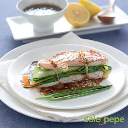 1. Irrora i filetti di triglia con un filo d’olio e succo di limone e salali. Pulisci carote e zucchine e riducile a strisce per il lungo. Scottale 30 secondi in acqua bollente salata, nella casseruola del cuociverdura. Scolale con la paletta conservando l’acqua.