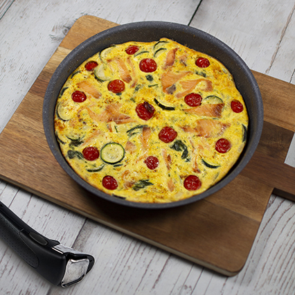 Soffriggete le verdure che avete scelto (spinaci, cipolle e zucchine) con burro, sale e pepe. Aggiungerete il formaggio cremoso, l'aneto tritato, le uova e mescolate con una spatola direttamente in padella, poi aggiungete i pomodorini a ciliegia e le fette di salmone. Cuocete direttamente in forno preriscaldato a 180 °C per 30 minuti (oppure iniziate a cuocere a fuoco bassissimo, e quando inizierà la cottura vera e propria mettete la teglia sotto la griglia del forno per far dorare).