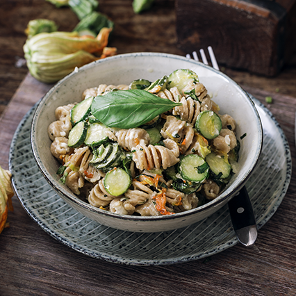 Mondate le zucchine e separatele dai fiori, che pulirete con un panno umido e priverete del pistillo interno. Tritate la cipolla e fatela appassire all’interno di Ingenio con un 4 cucchiai d’olio. Unite le zucchine tagliate a rondelle. Regolate di sale e pepe e cocetele per 10 - 15 minuti, mescolandole spesso. Sbriciolate la feta, spezzettate il basilico e tagliate i fiori a listarelle. Lessate la pasta e scolatela al dente, conservando un mezzo bicchiere di acqua di cottura. Mantecate la pasta con le zucchine, l’acqua di cottura, la feta, i fiori a listarelle e il basilico. Mescolate energicamente per amalgamare tutti gli ingredienti. Servite.