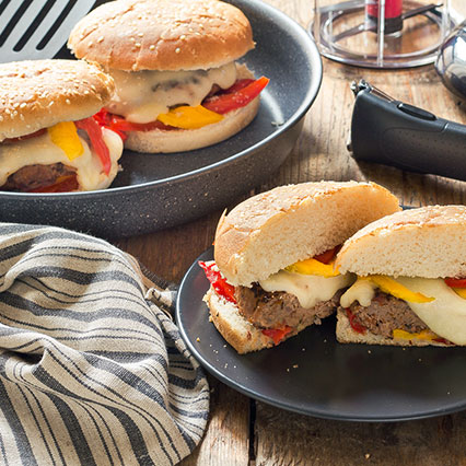 Componete ogni panino mettendo un po' di peperoni alla base, quindi l'hamburger, un paio di fette di scamorza, ancora qualche filetto di peperoni e ricoprite con la metà superiore del panino.