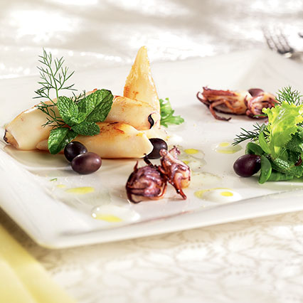 Insalatina di calamaretti e olive con salsa allo yogurt e misticanza
