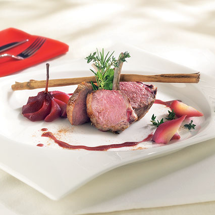 Lombata di agnello al vino rosso con insalata di pere alla cannella