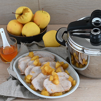 1. Prendiamo la lonza di maiale e leghiamola oppure facciamolo fare al nostro macellaio di fiducia. Nella Pentola a Pressione mettiamo un filo d' olio ed una noce di burro, lasciamo scaldare poi mettiamo a soffrigere bene la lonza in tutte le sue parti. Uniamo la cipolla, il sedano e carota tritati e lasciamo cuocere per qualche minuto.