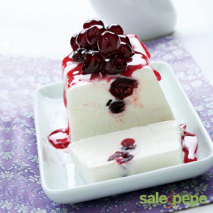 2. Monta gli albumi, con la frusta elettrica, e incorporali alla panna. Versa un dito del composto in uno stampo da plum cake (1 litro di capacità). Aiutandoti con la pinza, forma al centro una fila di amarene e colma con il composto rimasto.