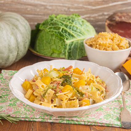Nella pentola a pressione fai scaldare un filo di olio EVO assieme alla cipolla tritata e allo speck; fai appassire la cipolla dopo di ché aggiungi la zucca e le verze. Rosola il tutto per 5 minuti, aggiungi le erbe aromatiche, l’acqua, il sale grosso e la pasta mista.