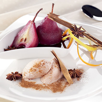 2 Fai sfiatare gradualmente il vapore, poi apri la pentola ed estrai le pere. Fai ridurre la salsa al vino per 1 minuto a fiamma alta, poi versalo sulle pere poste direttamente nei piatti o su un vassoio.