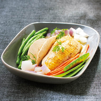 - Nella pentola a pressione, mettere il burro e far colorare leggermente i petti di pollo. Aggiungere le verdure e spolverare la farina, mescolando. Versare il brodo.