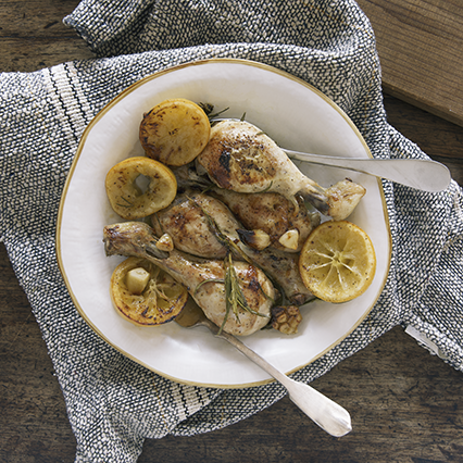 - Mettete i fusi di pollo in una ciotola capiente e aggiungete 4 cucchiai d'olio, il succo di 3 limoni, i restanti 2 tagliati a metà, mezzo aglio intero, il rosmarino e 100 ml d'acqua.