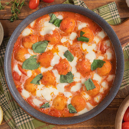 Una volta pronte aggiustale di sale e pepe, cospargi la superficie con la mozzarella sfilacciata o tritata e metti la padellina priva del suo manico in forno in modalità grill per 5 minuti per far sciogliere e rendere filante la mozzarella.