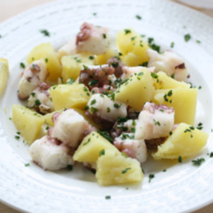 - Una volta pronto, scolate il polpo ed eliminate la pelle in eccesso. Tagliatelo a pezzettini e unitelo alle patate cotte, sbucciate e tagliate a tocchetti.