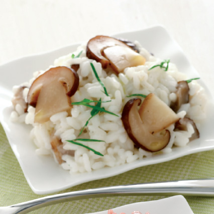 2 Unisci il riso e mescola bene. Versa il vino e lascialo sfumare aumentando la fiamma, poi aggiungi i funghi, mescola e copri con le 2 Ecodosi di brodo.