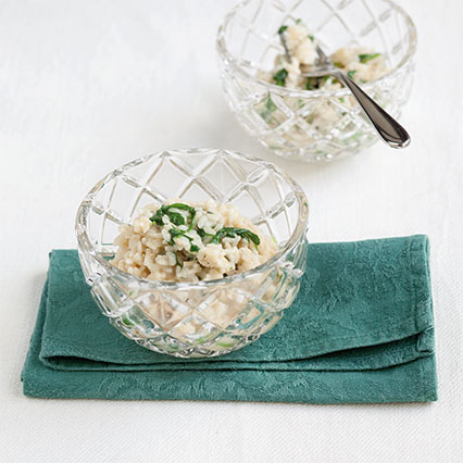 apri il coperchio. Se il riso è troppo liquido lascia cuocere ancora un po’ senza coperchio. Aggiungi il Parmigiano e mescola bene. Metti il risotto nei piatti da portata e aggiungi, se lo desideri, un filo d’olio a crudo.