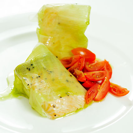 -tagliate e sfogliate il porro ricavando delle falche che serviranno per avvolgere il salmone.