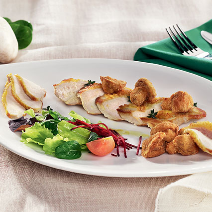 Scaloppa di petto di faraona con insalatina di campo e champignon dorati