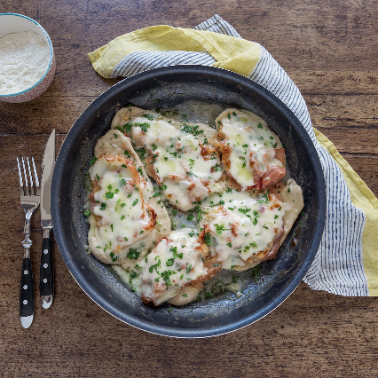 - Quando si sarà formata una salsina densa, spegnete il fuoco. Disponete sulla carne il prosciutto cotto e il formaggio, quindi infornate in modalità grill per qualche minuto, fino a quando il formaggio sarà completamente sciolto e filante.