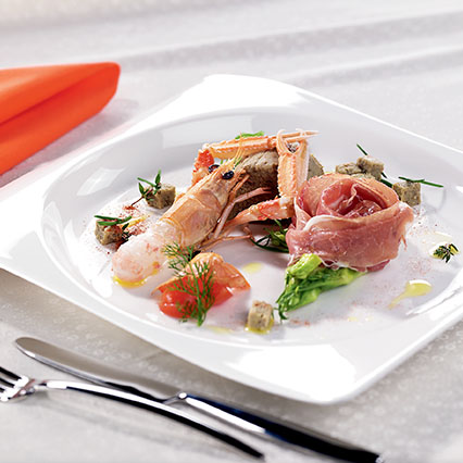 Cuocete le melanzane intere in forno, a 180°C,fino a quando la polpa risulterà molle al tatto. Poi, pelatele, togliete l'eventuale acqua che si sarà formata nel contenitore e frullatele. Unite alla polpa di melanzane le uova, il parmigiano, il sale, il pepe, la noce moscata, e amalgamate bene il composto. Passate con il burro e il parmigiano degli stampini, riempiteli con la farcia di melanzane e copriteli con un foglio di carta alluminio. Cuocete gli sformati nella pentola a pressione con 4 dl d'acqua e il cestello per 12 minuti calcolati dall'inizio del sibilo. Cuocete gli scampi puliti con solo la testa nel brodo preparato con il sedano, la carota, la cipolla, il sale, l'alloro e il vino bianco per 2 minuti circa dal momento in cui il liquido bolle. Sformate sul piatto il flan di melanzane e accompagnatelo con gli scampi conditi con una vinaigrette fatta con l'olio, il succo di limone, il sale e il pepe rosa. Decorate con due fette di prosciutto crudo composte a forma di rosa.