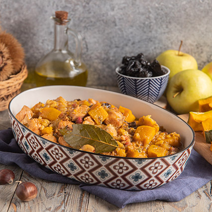 Nel frattempo, taglia in 4 le prugne e a metà le castagne, uniscile in una ciotola assieme alla zucca.