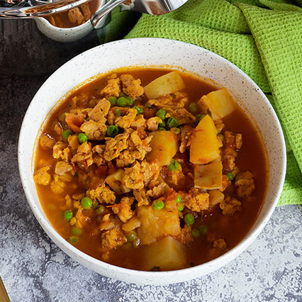 Versa nella PAP le patate a cubetti, i piselli ancora surgelati, la passata di pomodoro e il granulare vegano aggiungendo olio, sale e pepe. Versa 4 ecodosi, mescola e chiudi la PAP. Cuoci circa 20 minuti da quando va in pressione con la valvola su “verdura”. Una cena completa, equilibrata e genuina sporcando solo una pentola.