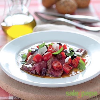 3. Copri la carne con i pomodorini, le olive e il basilico spezzettato. Sbatti in una ciotolina 3 cucchiai di olio, 1 cucchiaio di aceto balsamico, sale e pepe. Versa la salsina sulla tagliata e completa con il pecorino a scaglie.