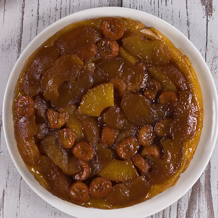 Preparate il caramello in una casseruola ben pulita, versando prima lo zucchero e poi un goccio d'acqua per farlo sciogliere. Cuocere a fuoco vivace. Non appena avrà raggiunto un colore bruno dorato, aggiungete il burro (attenzione agli schizzi che possono bruciare), e poi le mele tagliate in quattro spicchi. Cuocete a fuoco lento per 3 minuti, poi togliete la casseruola dal fuoco e aggiungete il resto della frutta, assicurandovi che la base della casseruola sia completamente coperta. Fate raffreddare leggermente e coprite con la pasta brisée, piegando i bordi verso l'interno. Cuocete in forno preriscaldato a 180 °C per 20 minuti. Lasciate raffreddare, poi capovolgete la crostata su un piatto da portata.
