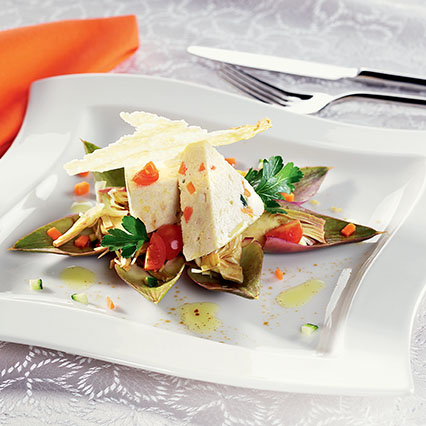 Cominciate tagliando le carote, le zucchine e i porri a julienne, cioè a listarelle sottili; poi fate cuocere velocemente il tutto con un filo d'olio d'oliva, a fuoco moderato in una padella antiaderente. Intanto, frullate il petto di pollo, aggiungete la panna, l’uovo, il sale, il pepe e, infine, le verdure stufate. Amalgamate bene. Ungete con l'olio d'oliva lo scodello ed adagiateci la farcia di carne e verdura. Fate cuocere nella pentola a pressione per 18 minuti con 4 dl d'acqua, calcolati dall'inizio del sibilo. Una volta cotta, togliete la terrina e lasciatela Raffreddare. Tagliate i carciofi a julienne e conditeli con sale, pepe e succo di limone. Stendete sul fondo di una padellina antiaderente il grana padano e fartelo cuocere fino a quando si sarà fuso. Toglietelo e lasciatelo raffreddare. Una volta fredda, spezzate la cialda di formaggio in quattro parti. Componete il piatto con i carciofi, una fetta di terrina, un quarto di cialda e un filo d'olio d'oliva extravergine.