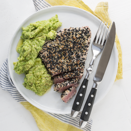 - Disponete il sesamo in un piatto e utilizzatelo per impanare il tonno. Cuocete il pesce all’interno della vostra padella Lagostina a fiamma alta, circa due minuti per lato.