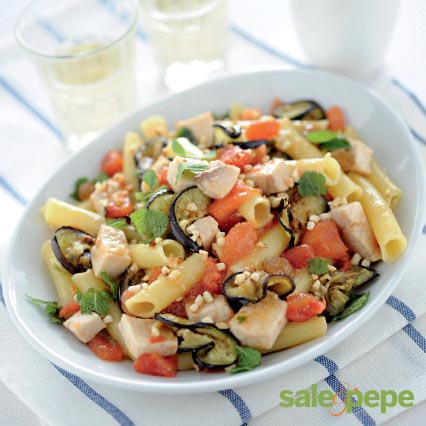 1. Taglia le melanzane a rondelle, spennellale d’olio, grigliale sulla piastra e salale. Porta a bollore l’acqua salata nella pastaiola, scotta i pomodori, scolali, elimina buccia, semi e riducili a dadini.