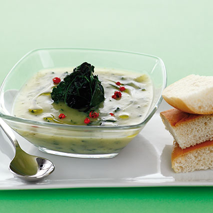 2 Lava il cavolo nero e taglia le foglie a strisce, eliminando la parte centrale più dura. Sbuccia le patate e tagliale a dadini di circa 1 cm ciascuno. Metti il cavolo e le patate nella pentola, mescola per insaporire, sala e pepa, poi versa i pelati. Aggiungi 3 Ecodosi di acqua. Unisci la foglia di alloro e poi chiudi il coperchio della pentola e alza la fiamma.