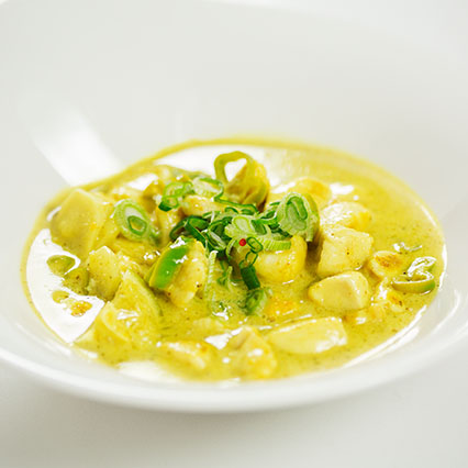 -aggiungete il curry e fate diventare tutto ben croccante, aggiungiete i friggitelli tagliati finemente qualche lamella di zenzero, una spruzzata di lime e il latte di cocco, salate e portate a cottura.